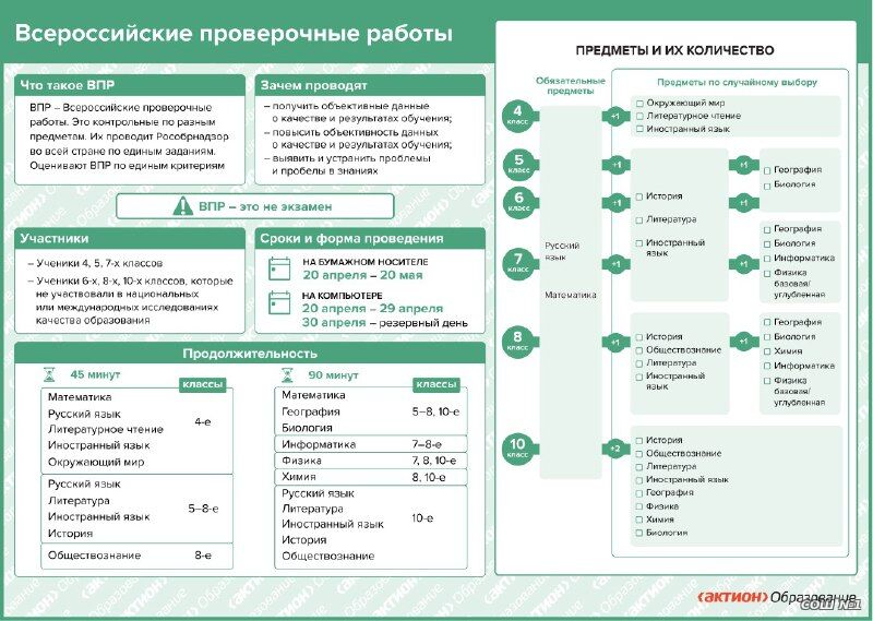 ВПР пройдут с 20 апреля по 20 мая, конкретную дату проведения проверочной работы по тому или иному предмету школа определяет самостоятельно. Проверочные работы в следующем учебном году пройдут в 4-8 и 10 классах. Их продолжительность составит один-два урока (45 или 90 минут).