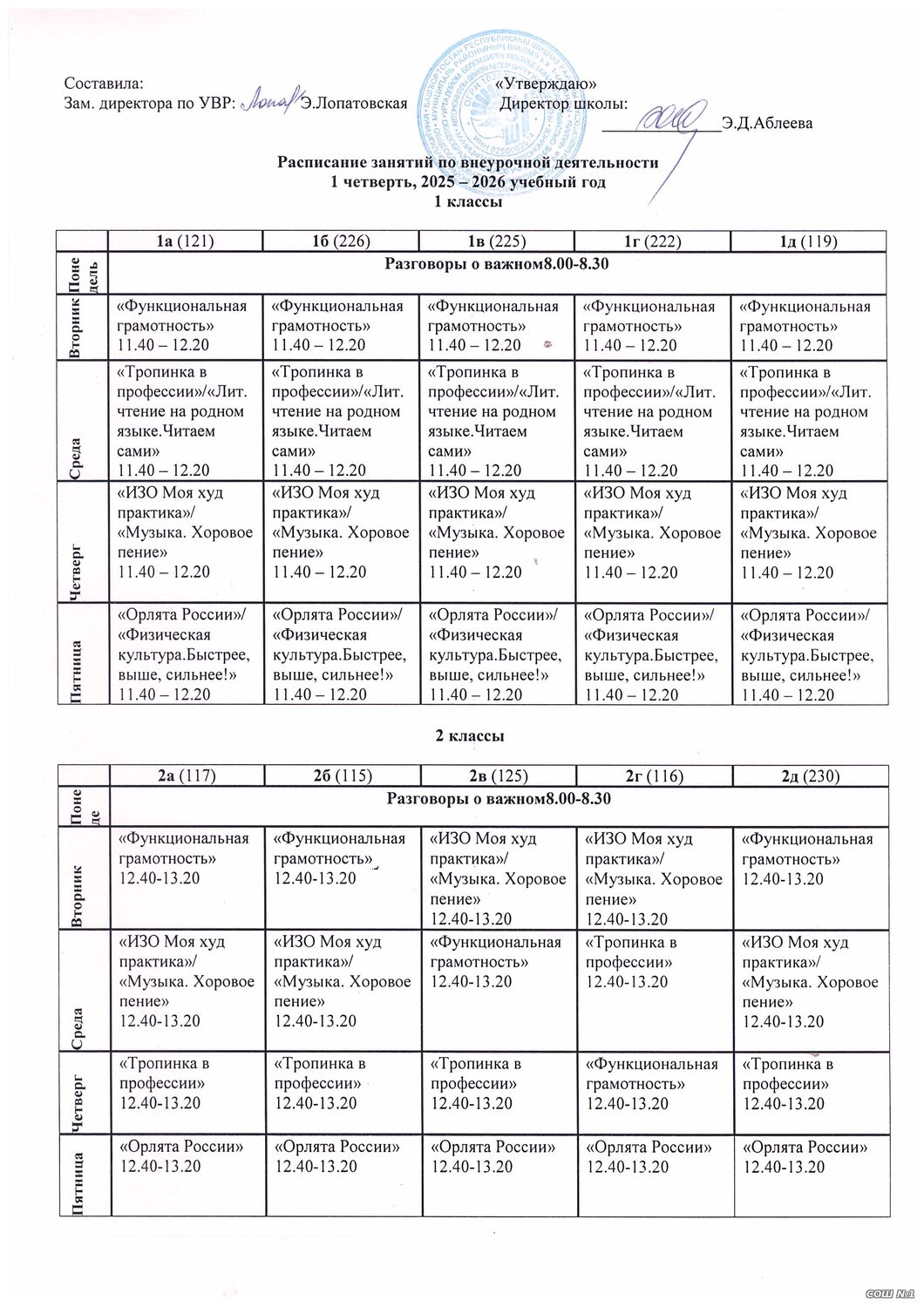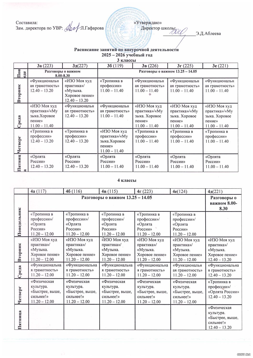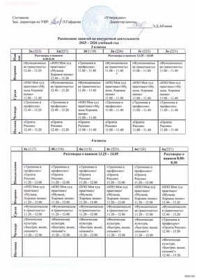 Расписание занятий внеурочной деятельности для обучающихся 1-4 классов